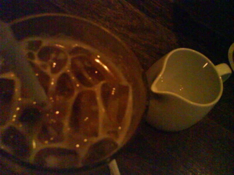 I went out for dinner with erv and chyehuat on friday, and between their conversations about financial plans, I took pictures of the pretty coasters and glasses. =)